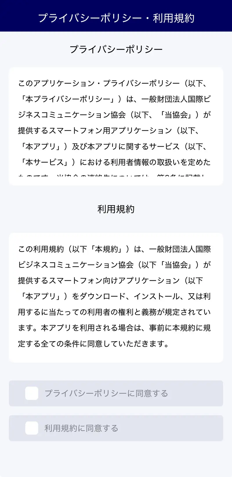 プライバシーポリシー・利用規約を最後まで確認し、同意のチェックボックスをタップします。