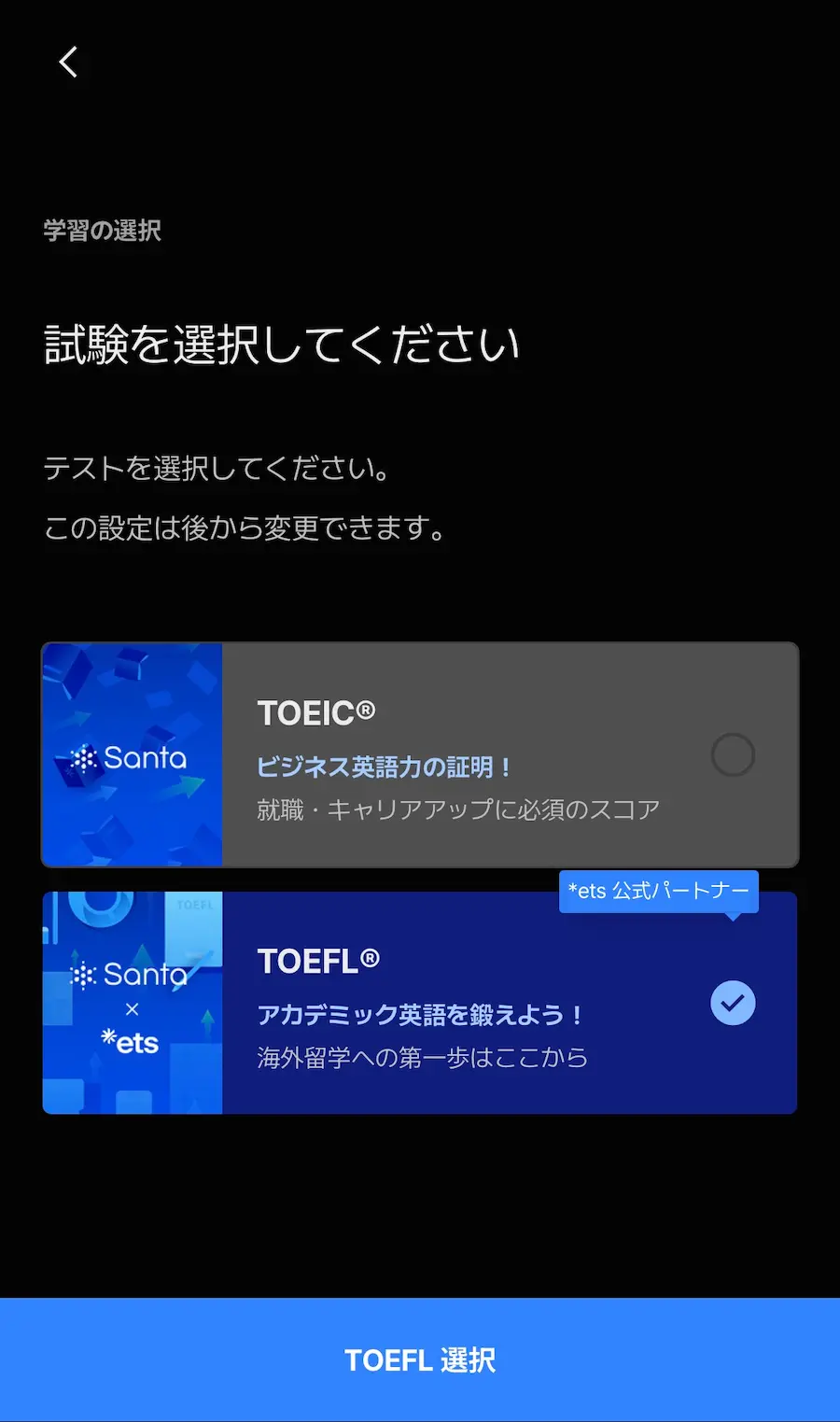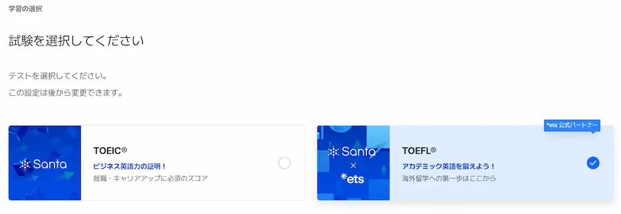 なお、TOEICを選択するとSantaアルクの設定に遷移します。