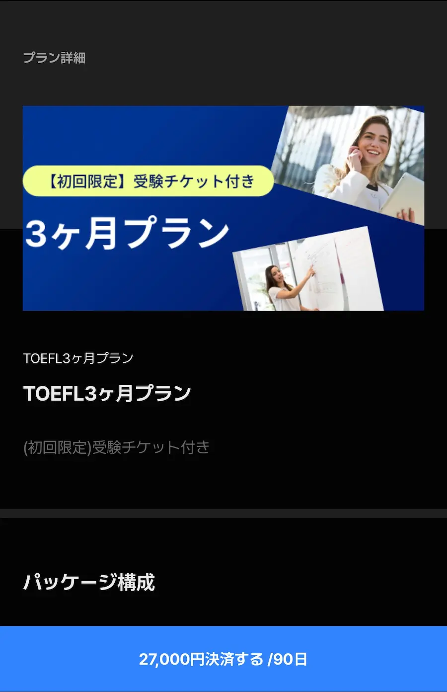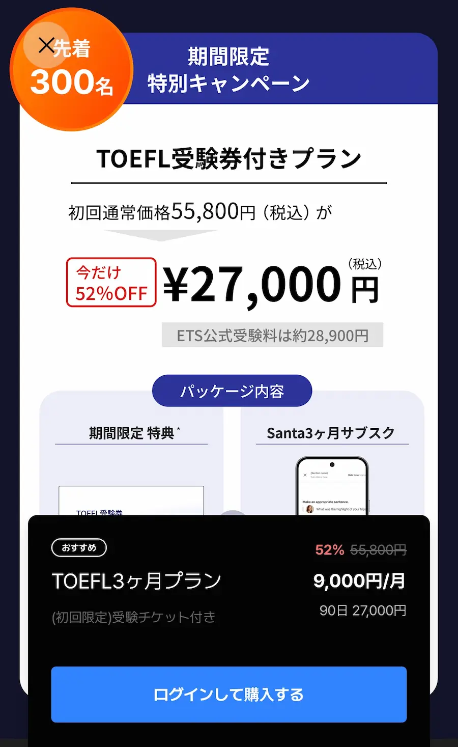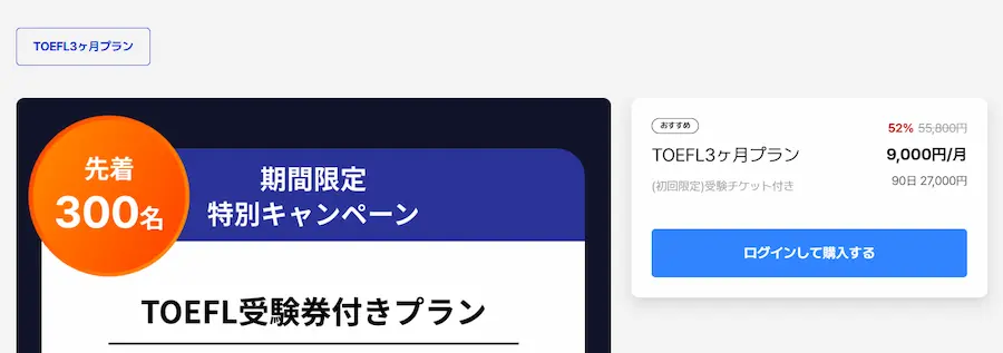 27,000円Santa TOEFLアプリが3ヶ月使い放題+TOEFL iBTが1回受験できるというキャンペーンです。